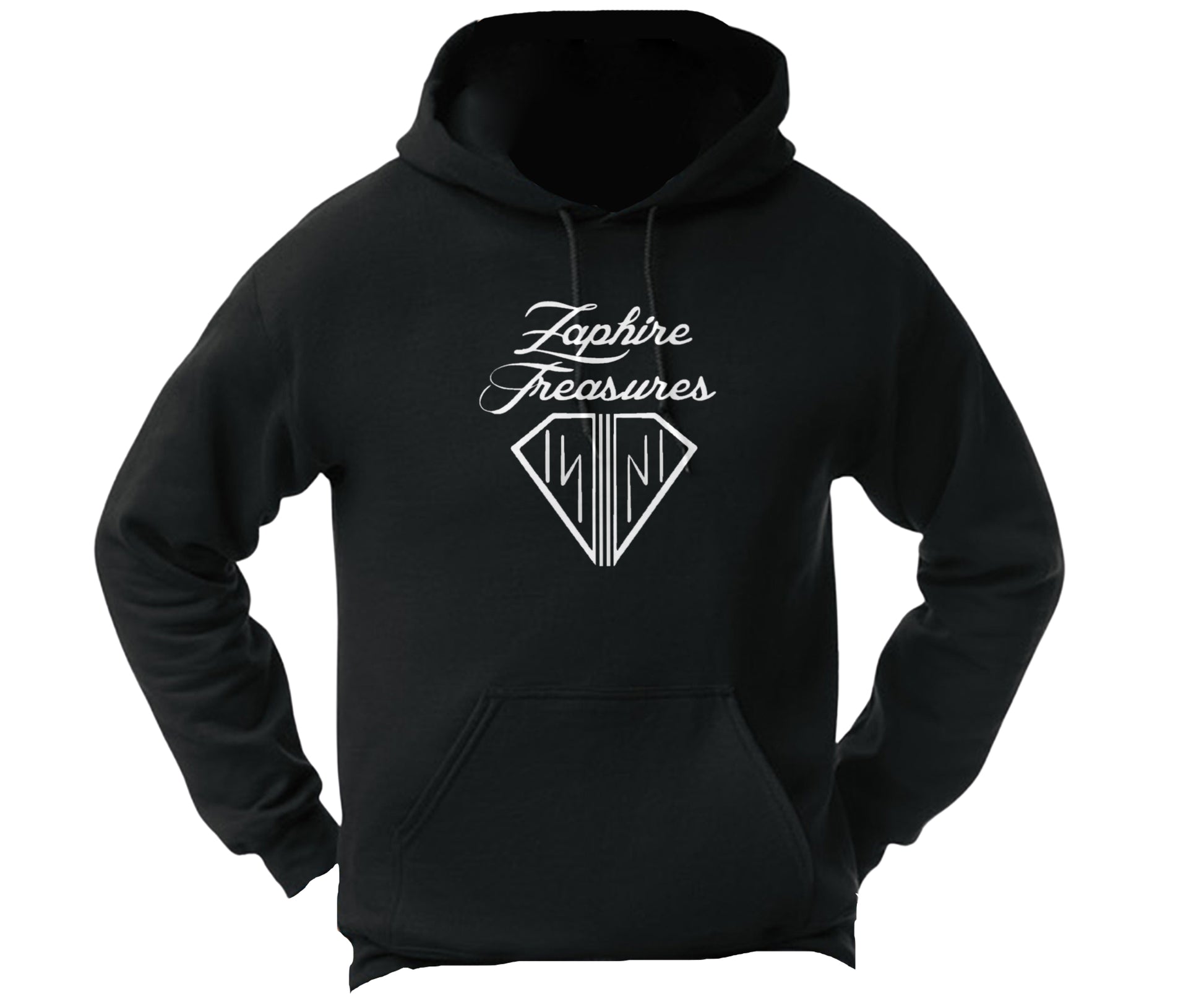 - Black hoodie with Zaphire Treasures wordmark and diamond logo